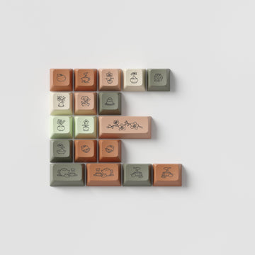 embrace earthy aesthetics and cozy vibes as you type with this maisy leigh inspired keycap set. surround yourself with zen plants, tea and decor, beautifully drawn by mysweetchubs.