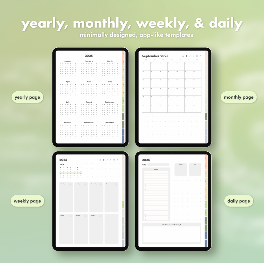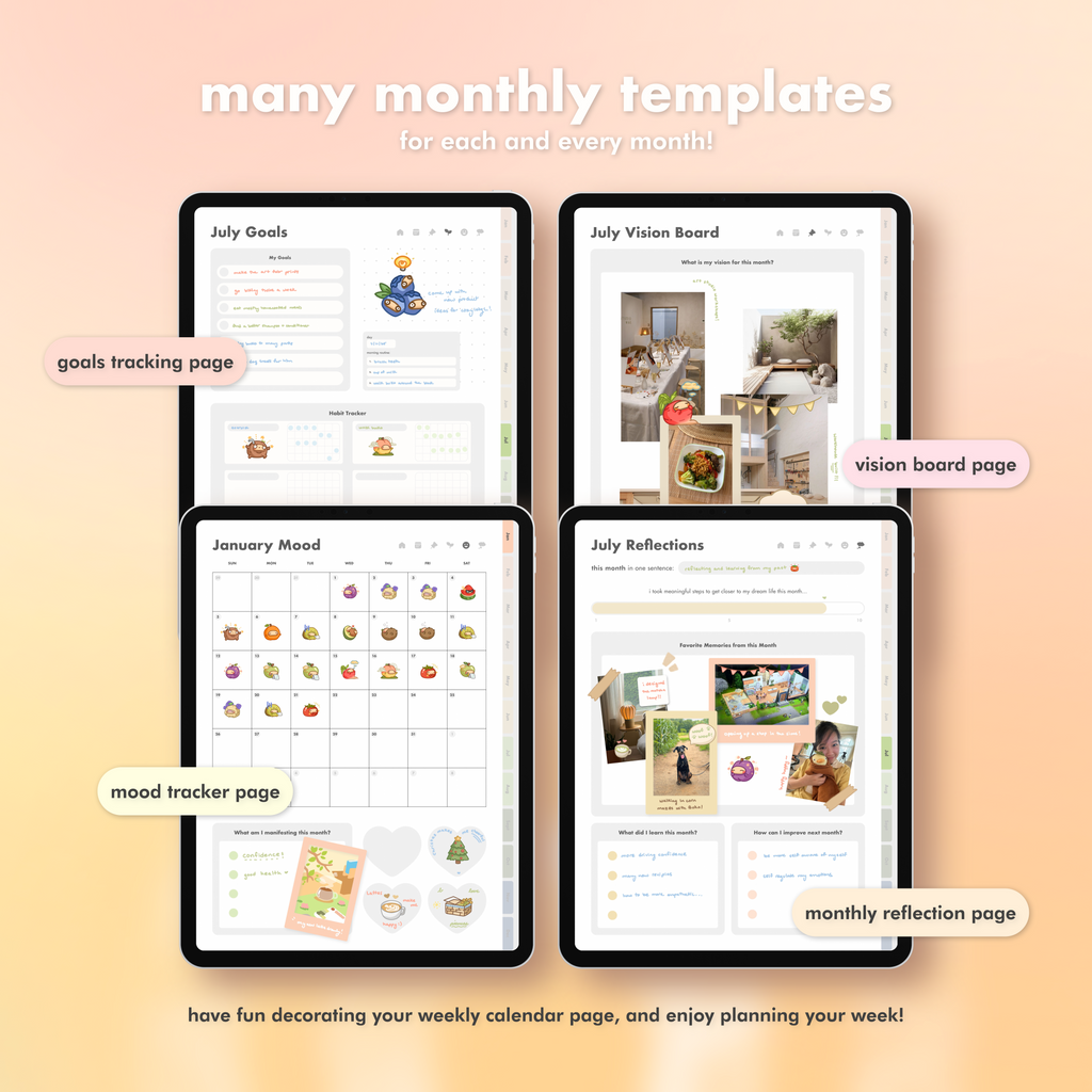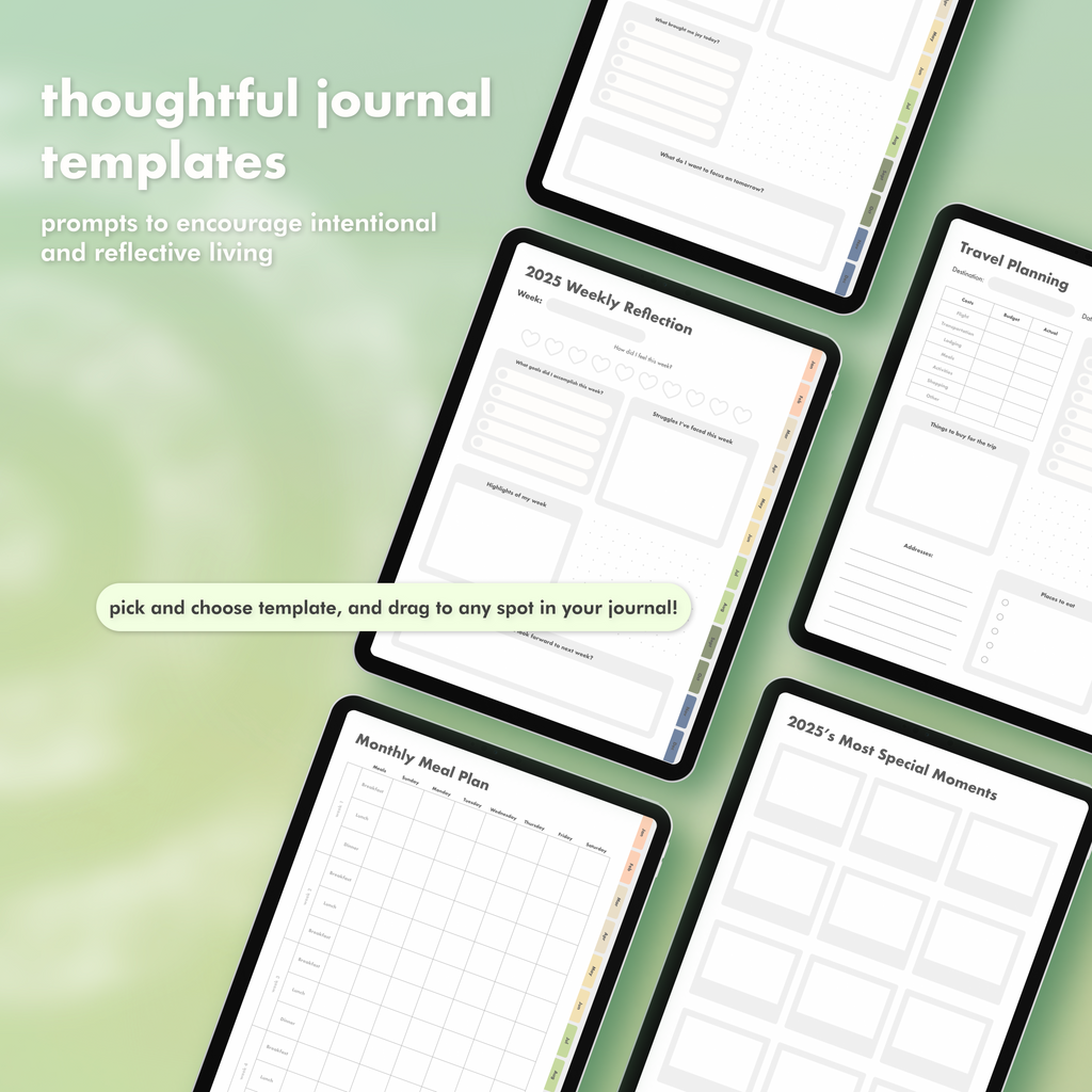 • Interactive Layouts: Custom-designed digital pages for goal-setting, daily planning, habit tracking, gratitude journaling, and more.